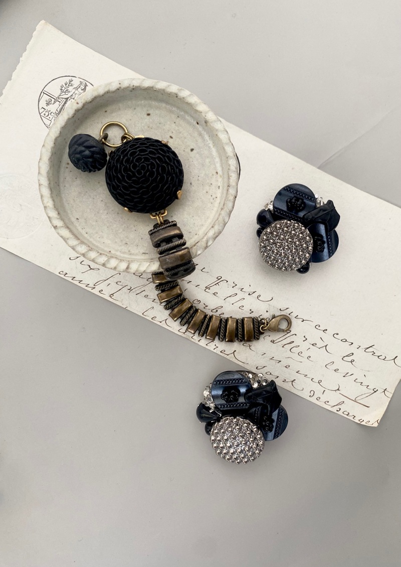 希少なガラスボタンとフランスで見つけたアンティークカラーのチェーンのブレスレットは、冬の装いに存在感をプラスしてくれます。